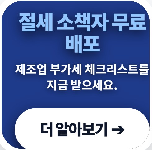 사업을 하시면서 세무 리스크를 예방하고 절세 기회를 잡는 것은 대표님의 가장 중요한 역할 중 하나입니다. 설비투자, 원재료, 외주가공 등 공제가 가능한 핵심 지출 항목과 자주 하는 실수를 완벽하게 정리한 제조업 사업자가 꼭 알아야 할 부가가치세 체크리스트 무료 소책자를 준비했습니다. 아래 링크를 클릭하시고 간단한 정보를 남겨주시면 담당자가 확인 후 소책자를 보내드리겠습니다. 불필요한 세금 누수를 막고 현금 흐름을 지키는 데 큰 도움이 되실 것입니다.