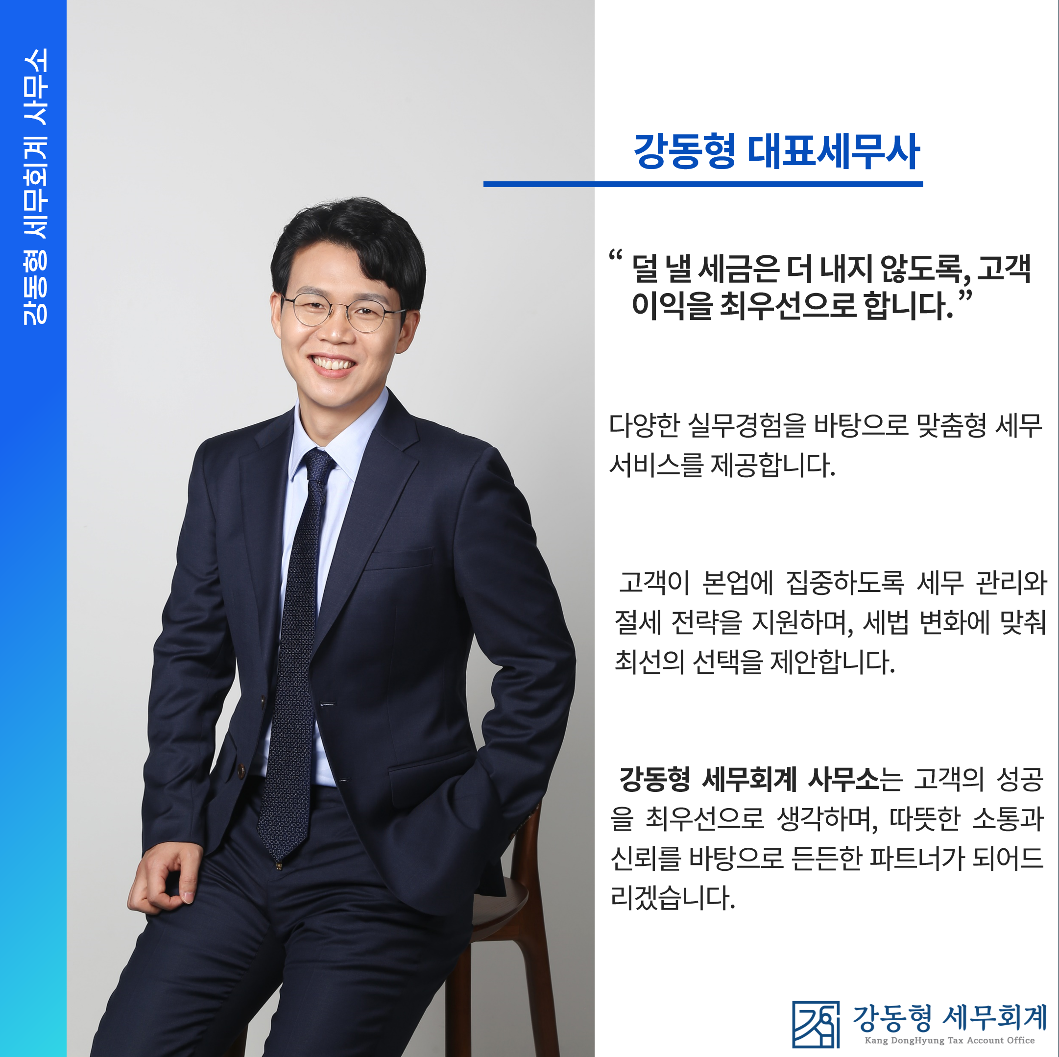 안녕하세요. 단순한 세금 계산을 넘어, 대표님의 비즈니스 맥락을 읽고 전략을 설계하는 파트너, 강동형 세무사입니다.,